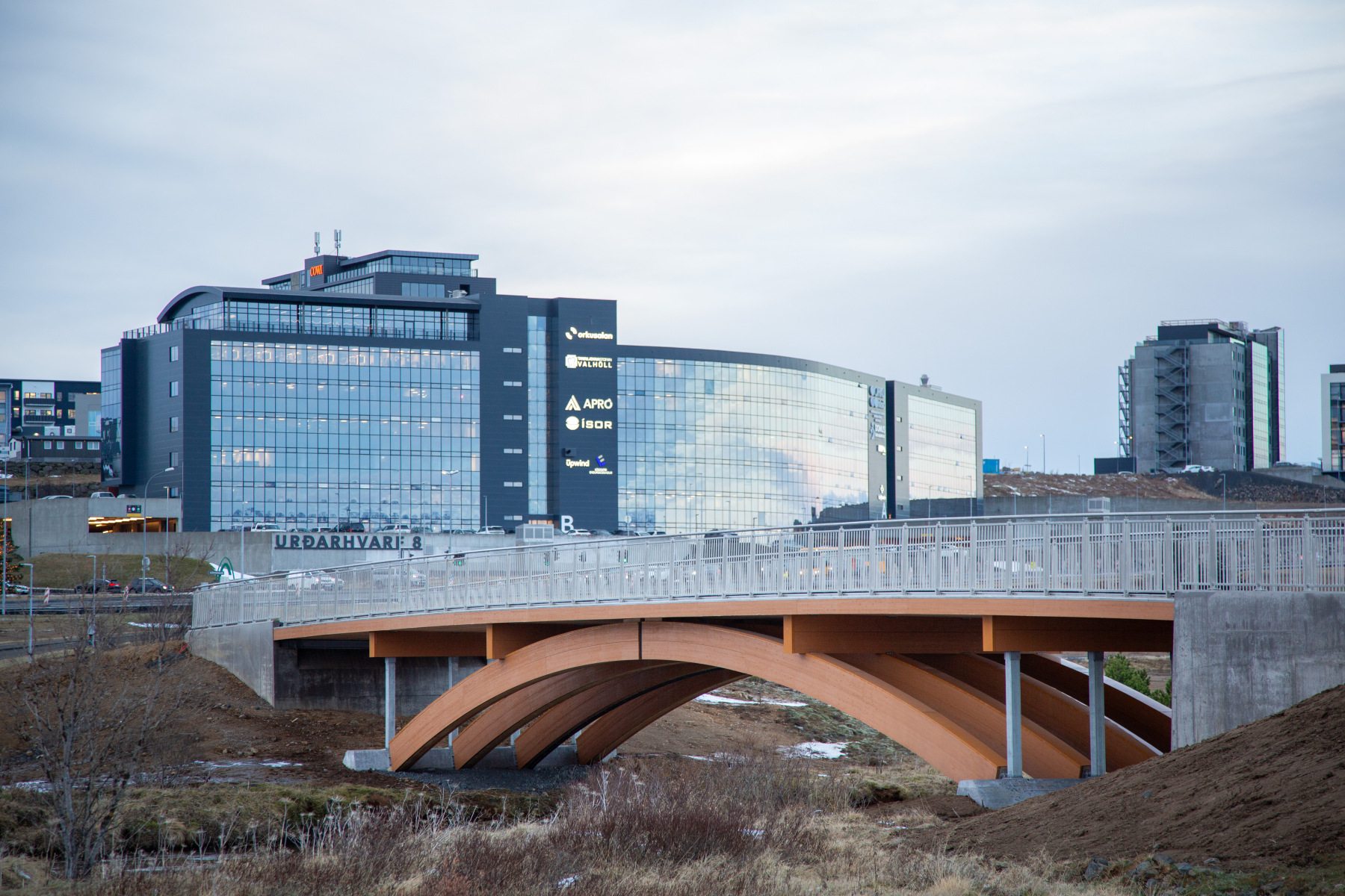 Göngubrúin yfir Elliðaárdal er glæsilegt dæmi um hvernig ólík byggingarefni geta unnið saman og myndað bæði fallega og hagnýta heild. Með burðarvirki úr límtré nýtir brúin styrk og náttúrulegt yfirbragð timbursins, á meðan malbikaður gönguflötur tryggir góða endingu og örugga notkun árið um kring.