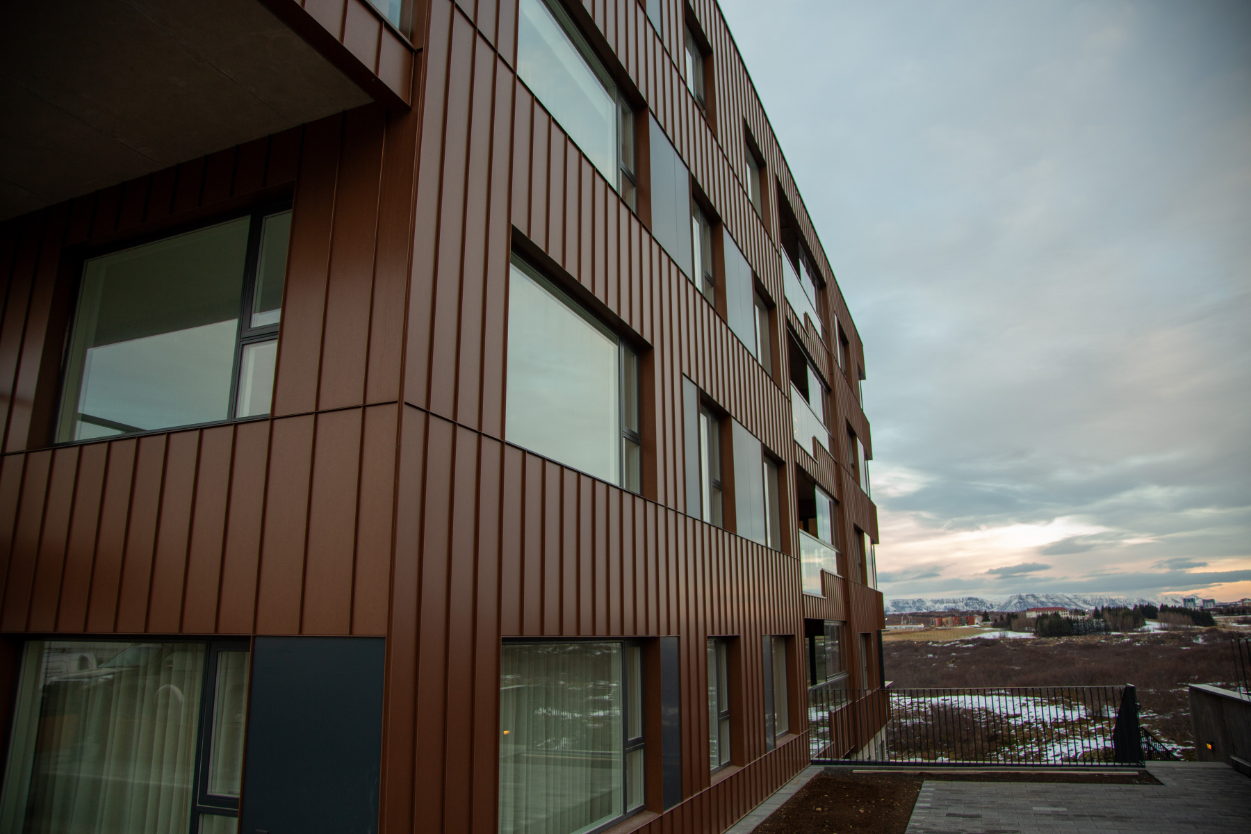 Fjörður hefur tekið miklum stakkaskiptum á árinu og bæði áfellur og klæðningarefni frá okkur hafa átt stóran þátt í þeirri þróun. Slétt, læst klæðning í fallega rauða litnum okkar setur sterkan og eftirminnilegan svip á bygginguna, á meðan áfellur um glugga og horn skapa skýra heild og vandað frágang.