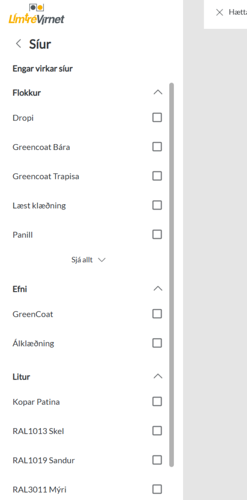 Mikilvægasta tólið til að einfalda leitina eru síurnar sem finna má vinstra megin. Með því að opna síurnar er hægt að þrengja valið eftir því sem þú ert að leita að formi, lit og hráefni.